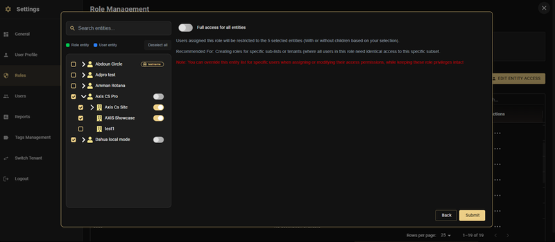 - Click Edit Entity Access from the Role Management page