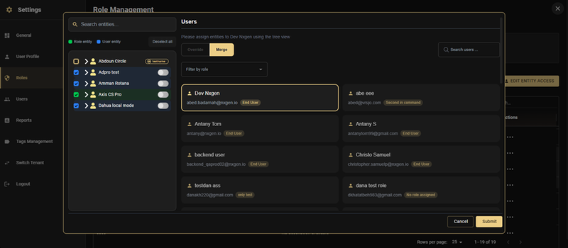 - Right panel: Users list with search, role filtering, and Override/Merge mode tabs