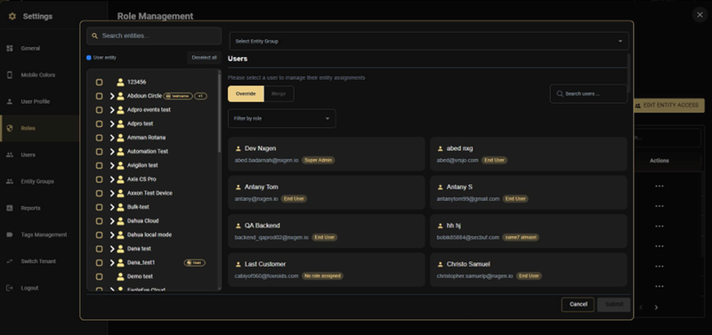In Edit Entity Access (per-user): After selecting a user in the Edit Entity Access panel, use the Select Entity Group dropdown at the top to quickly load a group's entities for that user. The Override or Merge mode setting still applies β the group simply pre-populates the entity selection.