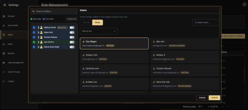 You can also filter the user list by role using the dropdown at the top of the right panel, making it easy to manage entity access for all users of a particular role.