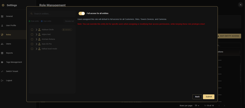 Full Access for All Entities (toggle ON): Users assigned this role will default to full access for all Customers, Sites, Towers/Devices, and Cameras.