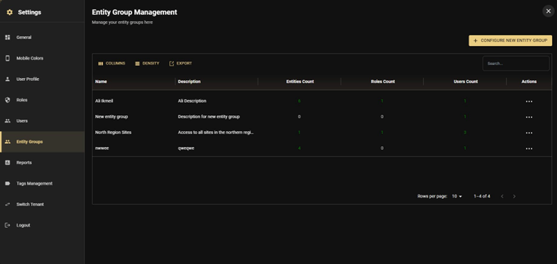 Entity Groups are saved, reusable collections of entities (customers, sites, devices, and sensors) that act as templates. Instead of manually selecting the same entities every time you configure a role or assign user access, you define the group once and apply it wherever needed. Think of an Entity Group as a named shortcut for a specific set of entities.