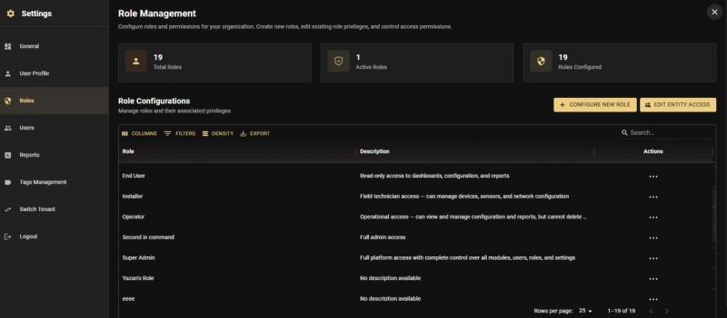 - Installer β Field technician access β can manage devices, sensors, and network configuration. Manage physical devices and sensors. Configure network settings. Install and set up hardware. Troubleshoot device issues. Cannot manage users or roles.