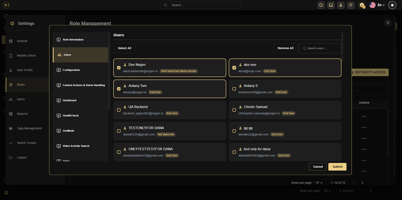 Select which users should be assigned to this role. The Users step displays all available users in a searchable grid with their current role badges. Click on a user card to select them (highlighted with a gold border). Use Select All, Remove All, or Search Users for bulk management.