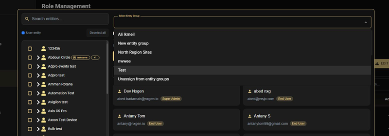 During role entity assignment (Step 4 of role creation/editing): In the entity selection screen, use the Select Entity Group dropdown to apply a saved group. All entities in that group are immediately loaded into the selection. All users of the role will inherit those entities.