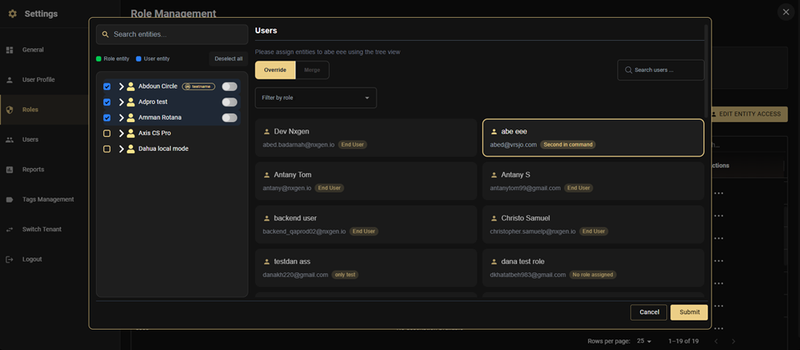 - Right panel: Users list with search, role filtering, and Override/Merge mode tabs