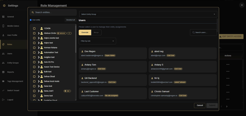 In Edit Entity Access (per-user): After selecting a user in the Edit Entity Access panel, use the Select Entity Group dropdown at the top to quickly load a group's entities for that user. The Override or Merge mode setting still applies β the group simply pre-populates the entity selection.
