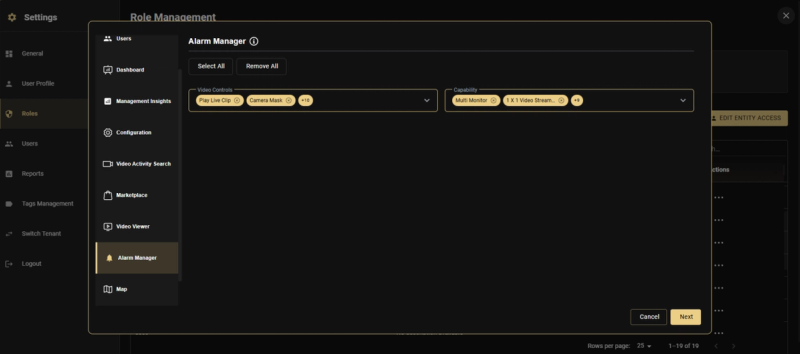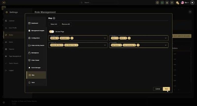 - Module Privileges: Enable Dashboard, Video Viewer, Alarm Manager, Map with desired capabilities