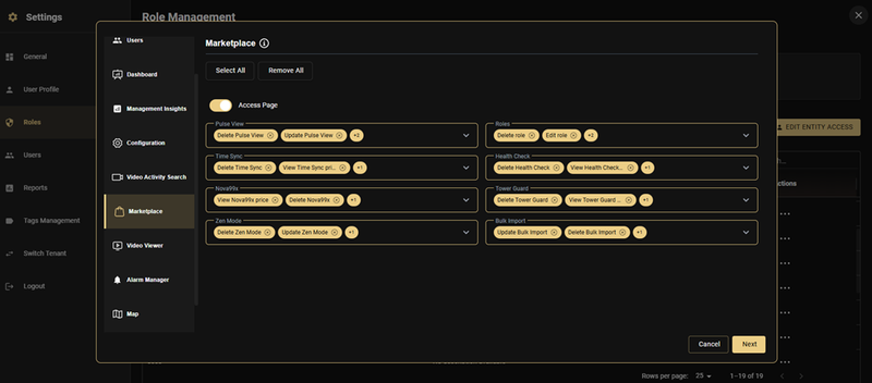 Each module has a Select All / Remove All option for quick bulk configuration, plus an Access Page toggle that enables or disables the entire module.