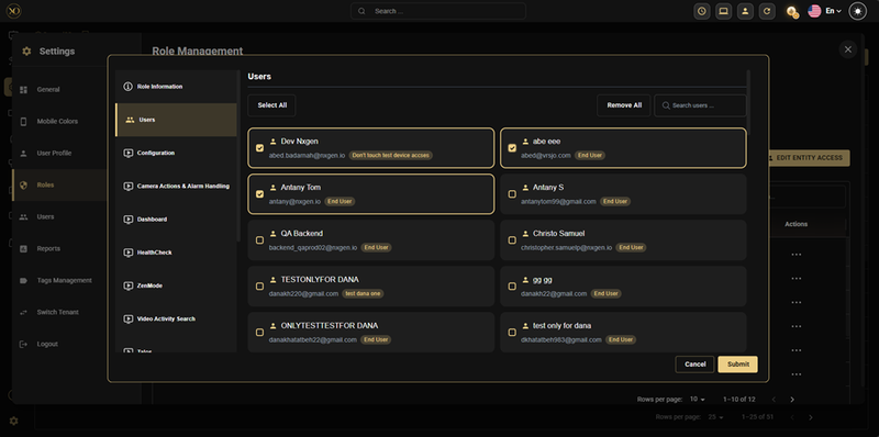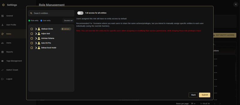 You can also filter the user list by role using the dropdown at the top of the right panel, making it easy to manage entity access for all users of a particular role.