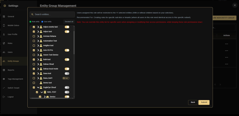During role entity assignment (Step 4 of role creation/editing): In the entity selection screen, use the Select Entity Group dropdown to apply a saved group. All entities in that group are immediately loaded into the selection. All users of the role will inherit those entities.