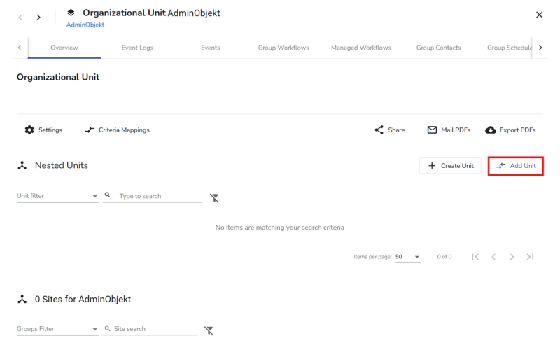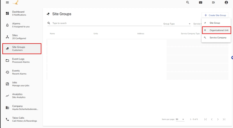 Log into the Talos Workflow application and navigate to Site Groups. Click Create Site Group and select Organizational Unit. Create units corresponding to your desired groups (e.g., Prod Sites and Test Sites), then include the corresponding sites or site groups into each unit.