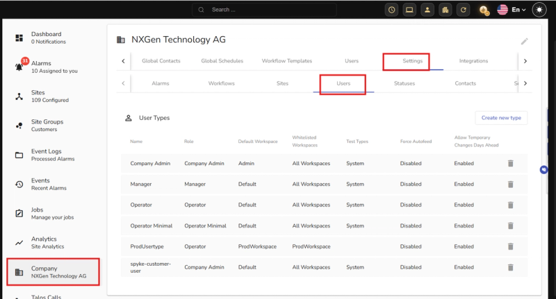 Navigate to Company β Settings β Users and create Day Operator and Night Operator User Types. For each configure: